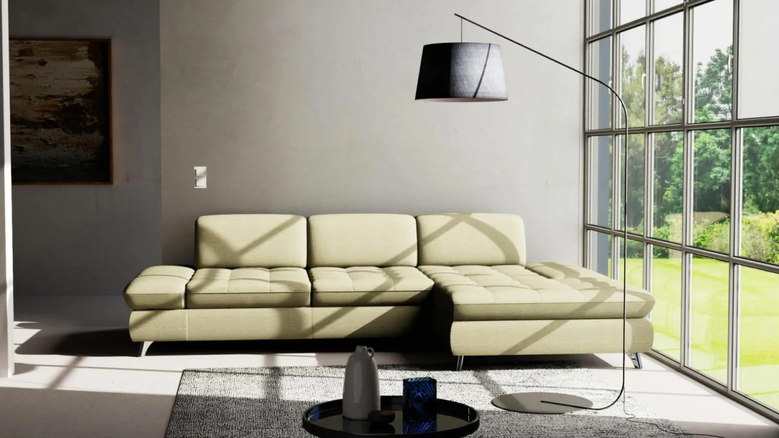 Entdecken Sie die perfekte Kombination aus Stil und Funktionalität mit der Ramira Eckgarnitur in modernem Design. Die großzügigen Abmessungen von 316 cm Breite und 186 cm Tiefe bieten ausreichend Platz für Entspannung und Komfort. Der grüne Stoffbezug verleiht Ihrem Raum eine frische Note und passt sich mühelos an verschiedene Einrichtungsstile an. Die stabile Metallkonstruktion der Füße sorgt für Langlebigkeit, während der Echtrücken die Optik von allen Seiten attraktiv macht. Genießen Sie eine angenehme Sitzhöhe von 43 cm und lassen Sie sich von der hochwertigen Verarbeitungsqualität überzeugen.