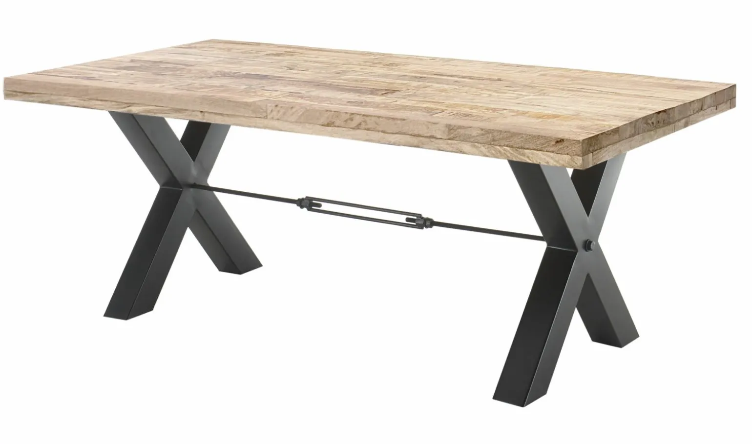Der Dehli Esstisch bietet eine perfekte Mischung aus modernem Design und funktionaler Eleganz. Mit seiner rechteckigen Form und den großzügigen Maßen von 200 cm Breite und 100 cm Tiefe ist er ideal für gesellige Abende und große Familienessen. Die massive Holzplatte in warmem Braun wird von einem stabilen schwarzen Metallgestell in X-Form getragen, das nicht nur optisch beeindruckt, sondern auch eine hohe Belastbarkeit von bis zu 180 kg gewährleistet. Dieses stilvolle Möbelstück wird zum Mittelpunkt Ihres Esszimmers und sorgt für ein harmonisches Ambiente.