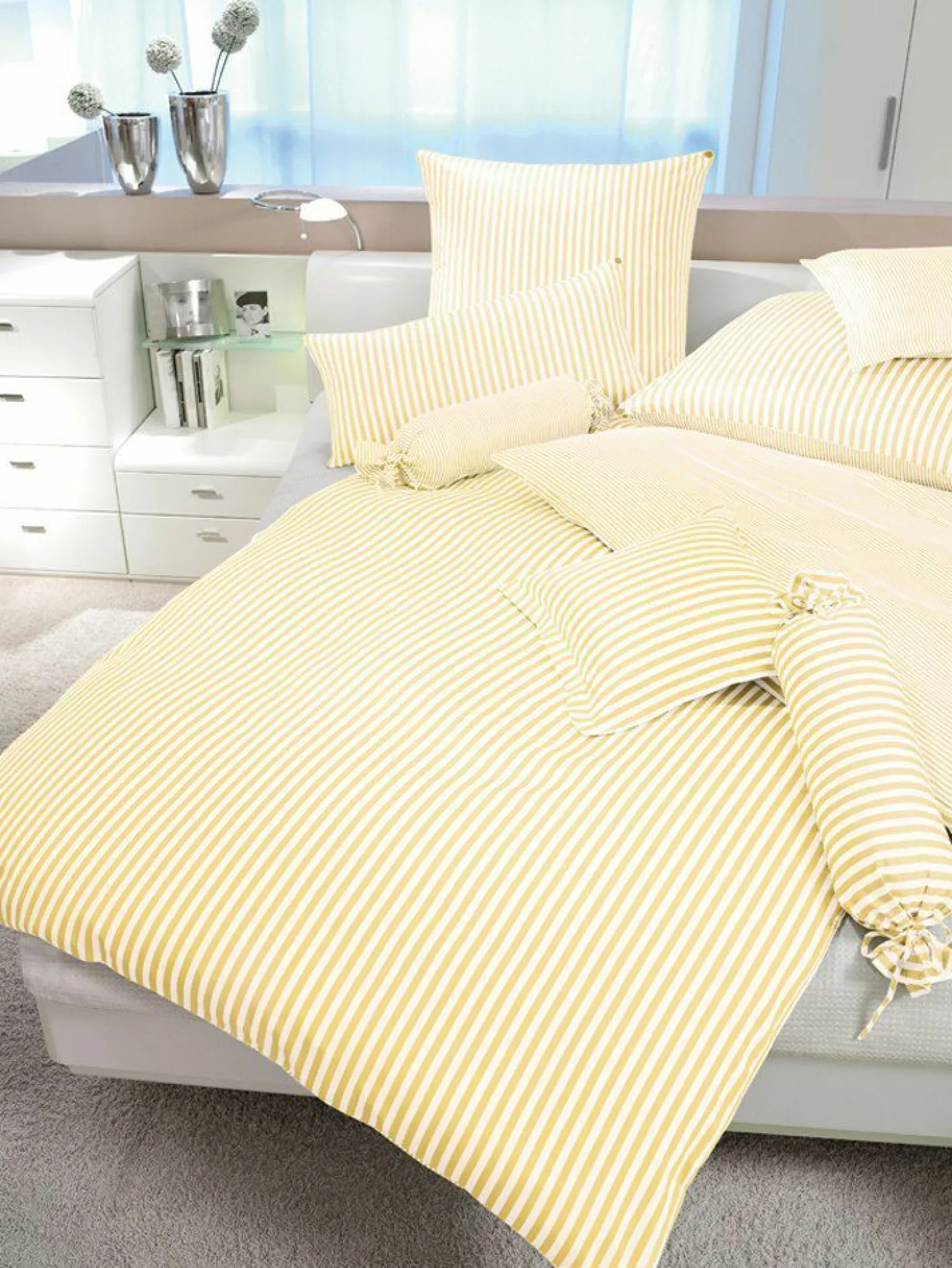 Setzen Sie mit der Mako-Satin-Bettwäsche im Modell Modernclassic Hellgelb einen frischen Akzent in Ihrem Schlafzimmer. Diese Bettwäsche besteht zu 100% aus Baumwolle und bietet damit ein angenehm weiches und atmungsaktives Schlafklima. Ihr lebhaftes Gelb bringt Farbe in Ihre Schlafumgebung und harmoniert wunderbar mit verschiedensten Einrichtungsstilen. Das Modell Modernclassic überzeugt durch seine qualitativ hochwertige Verarbeitung und die Verwendung von reinem Mako-Satin, welches für seine Langlebigkeit und seinen Komfort bekannt ist. Genießen Sie jeden Abend das Gefühl von Luxus und Komfort mit dieser exklusiven Bettwäsche.