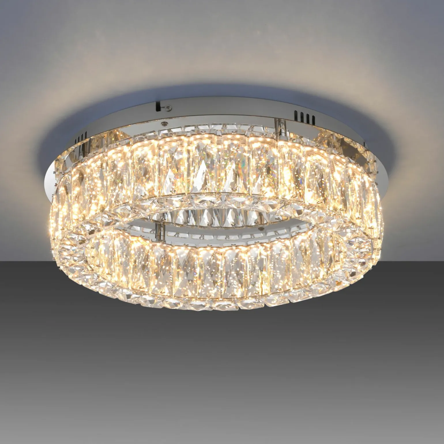 Die Kulunka LED-Deckenleuchte beeindruckt mit ihrem eleganten, runden Design und einer edlen silbernen Farbgebung. Mit einer Höhe von 12,1 cm und einem Durchmesser von 40 cm ist diese Leuchte aus hochwertigem Glas gefertigt und fügt sich harmonisch in jeden Raum ein. Dank der modernen LED-Technologie sorgt sie für eine effiziente und gleichmäßige Beleuchtung, die sowohl funktional als auch ästhetisch ansprechend ist. Die Kulunka ist ideal für Wohn- und Geschäftsräume und setzt stilvolle Akzente an der Decke, die Ihre Inneneinrichtung aufwerten.