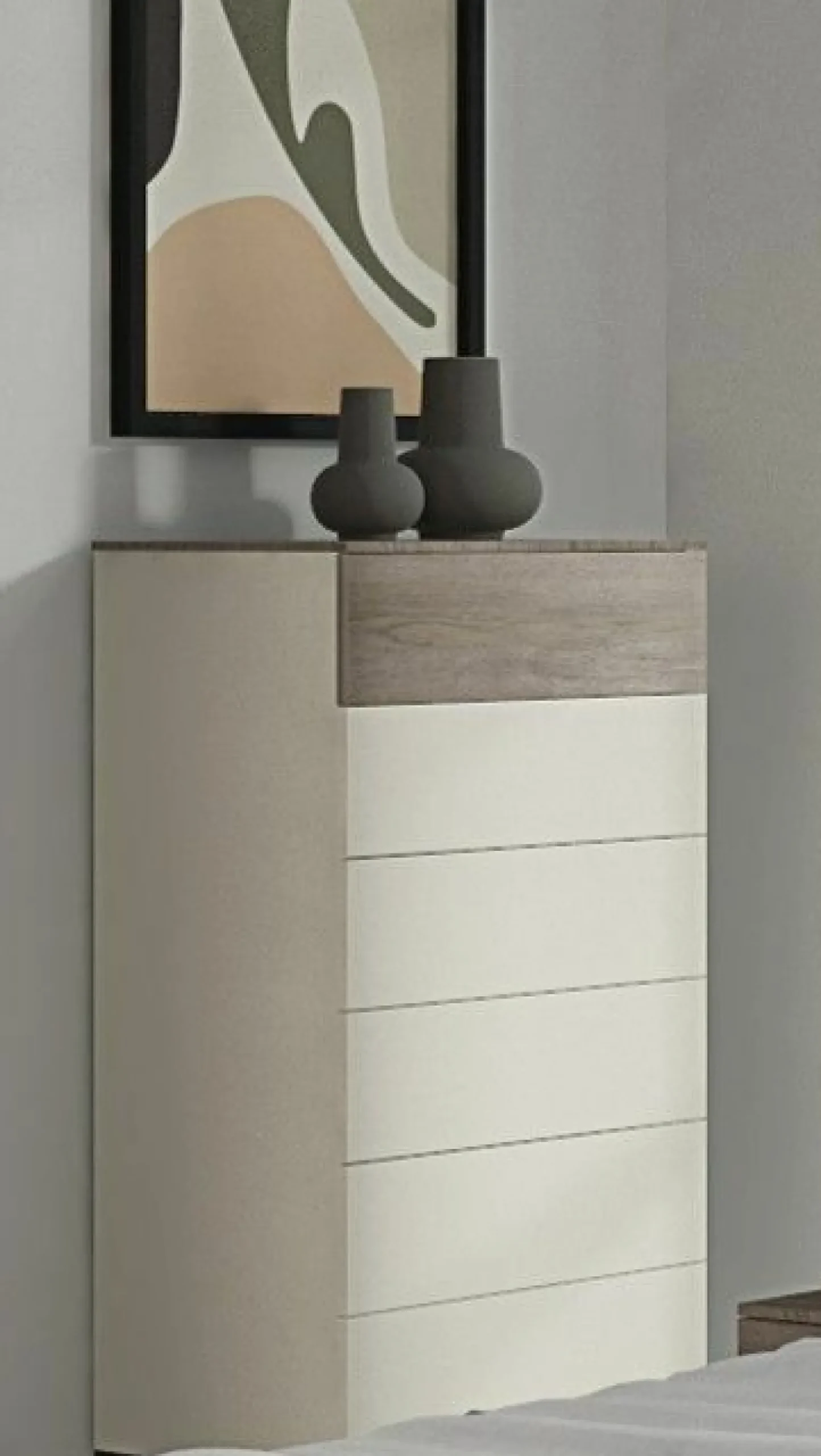Entdecken Sie die stilvolle Calia Kommode, die Eleganz und Funktionalität in Perfektion vereint. Gefertigt aus hochwertigem Holzfaserwerkstoff, bietet sie nicht nur Stabilität, sondern auch eine ansprechende Optik in zeitlosem beige-weiß. Diese Kommode ist die ideale Ergänzung für jedes Wohn- oder Schlafzimmer, da sie durch ihr schlichtes Design und die dezente Farbgebung in jeden Einrichtungsstil harmonisch integriert werden kann. Mit großzügigem Stauraum ausgestattet, sorgt sie für Ordnung und Übersichtlichkeit. Lassen Sie sich von der Kombination aus Design und Funktion überzeugen.