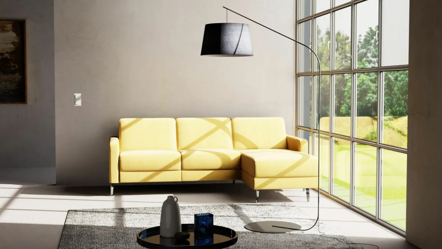 Die Liv’in Malmö Eckgarnitur besticht durch ihr zeitloses Design und eine warme, gelbe Farbgebung, die jedem Wohnraum eine frische und einladende Atmosphäre verleiht. Mit einer Höhe von 88 cm und einer Breite von 234 cm bietet sie großzügigen Komfort. Der Bezug aus hochwertigem Stoff sorgt für ein angenehmes Sitzgefühl, während die robuste Metallkonstruktion der Füße Stabilität und Langlebigkeit garantiert. Die Sitzhöhe von 45 cm und die Tiefe von 163 cm machen das Modell zu einem idealen Ort der Entspannung, egal ob für gesellige Runden oder ruhige Stunden allein. Der Echtrücken bietet vielseitige Platzierungsmöglichkeiten.