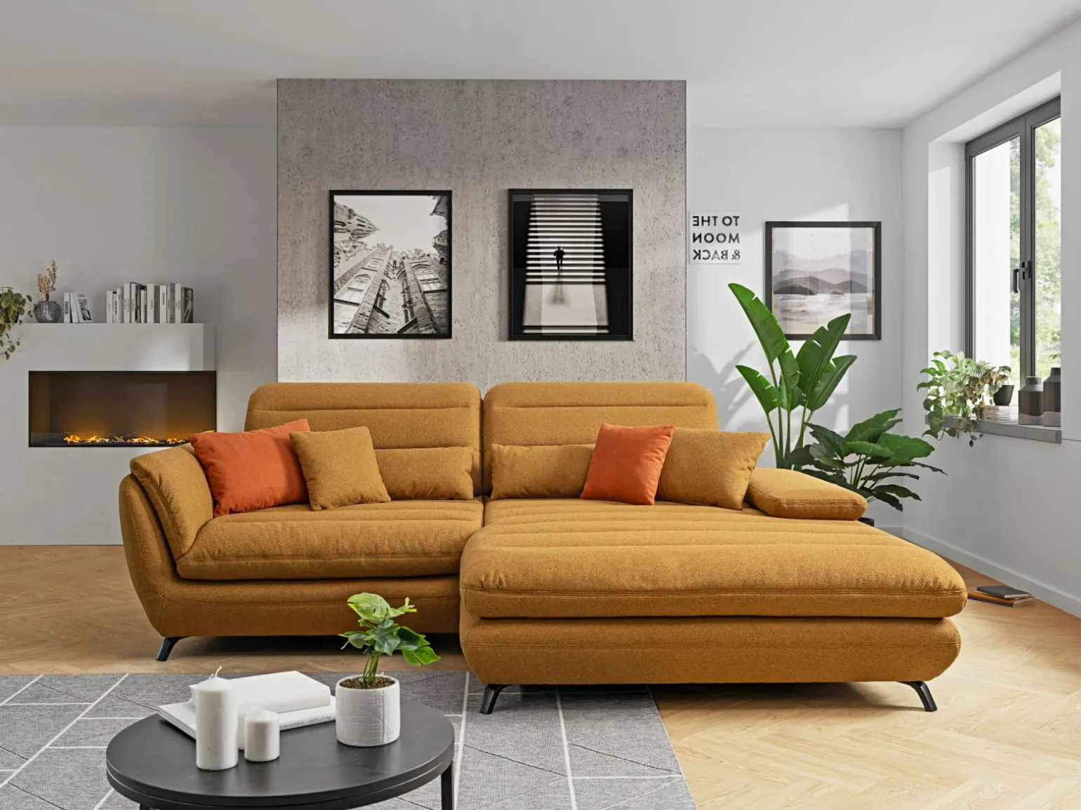 Die Eckgarnitur Liv’in Stresa bringt modernen Stil und Eleganz in Ihr Wohnzimmer. Mit einer großzügigen Breite von 275 cm und einer komfortablen Sitzhöhe von 45 cm bietet dieses Möbelstück ausreichend Platz für Entspannung und Geselligkeit. Das leuchtende Gelb des hochwertigen Stoffbezugs zieht alle Blicke auf sich und setzt farbliche Akzente in jedem Raum. Mit einer Tiefe von 216 cm ist die Eckgarnitur ideal für gemütliche Abende. Der Echtrücken gewährleistet, dass dieses Möbelstück auch frei im Raum platziert werden kann, ohne an Stil zu verlieren.