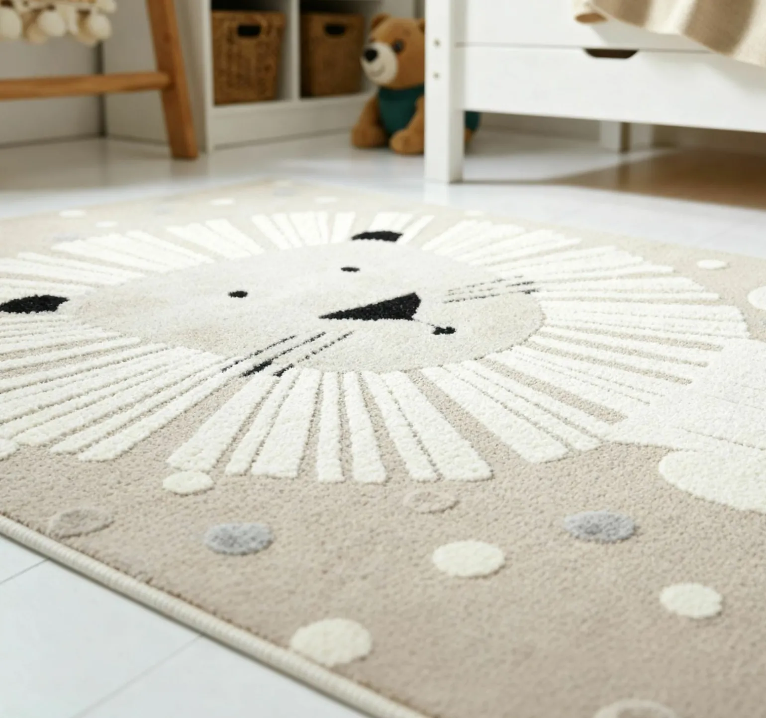 Erleben Sie den modernen LION Kids Kinderteppich in einem eleganten Beige, der perfekt in jedes Kinderzimmer passt. Mit seiner rechteckigen Form und den Maßen von 80 cm Breite und 150 cm Länge bietet er ausreichend Platz zum Spielen und Entspannen. Hergestellt aus hochwertigen Kunstfasern, vereint dieser Teppich die strapazierfähigen Eigenschaften von 50% Polypropylen und 50% Polyester. Der moderne Stil und das charmante Löwen-Design machen ihn zu einem Blickfang, der Kinder begeistert. Dieser Teppich ist nicht nur ein dekoratives Element, sondern auch pflegeleicht und langlebig.