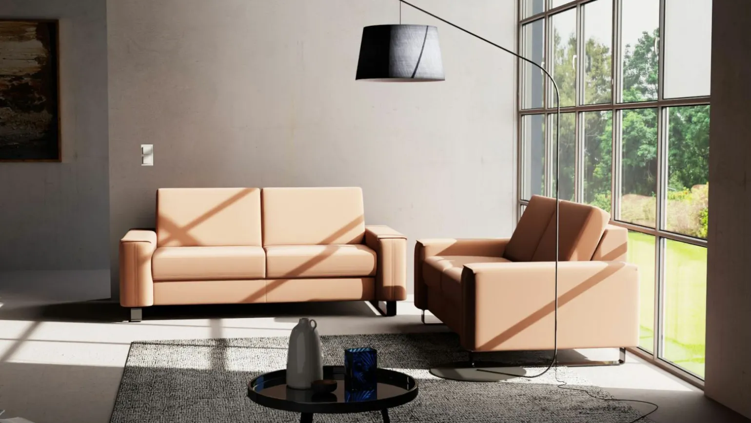 Erleben Sie modernen Komfort mit der MONDO Maestra Polstergarnitur in elegantem Braun. Das hochwertige Leder verleiht Ihrem Wohnraum eine luxuriöse Note und bietet zugleich langlebige Qualität. Die großzügige Sitzfläche mit einer Tiefe von 53 cm lädt zum Entspannen ein, während die angenehm abgestimmte Sitzhöhe von 46 cm optimalen Komfort bietet. Entworfen für den modernen Lebensstil, vereint diese Polstergarnitur stilvolles Design mit praktischer Funktionalität. Perfekt für jene, die Wert auf zeitgemäße Eleganz und erstklassige Materialien legen. Holen Sie sich ein Stück luxuriösen Komfort in Ihr Zuhause.