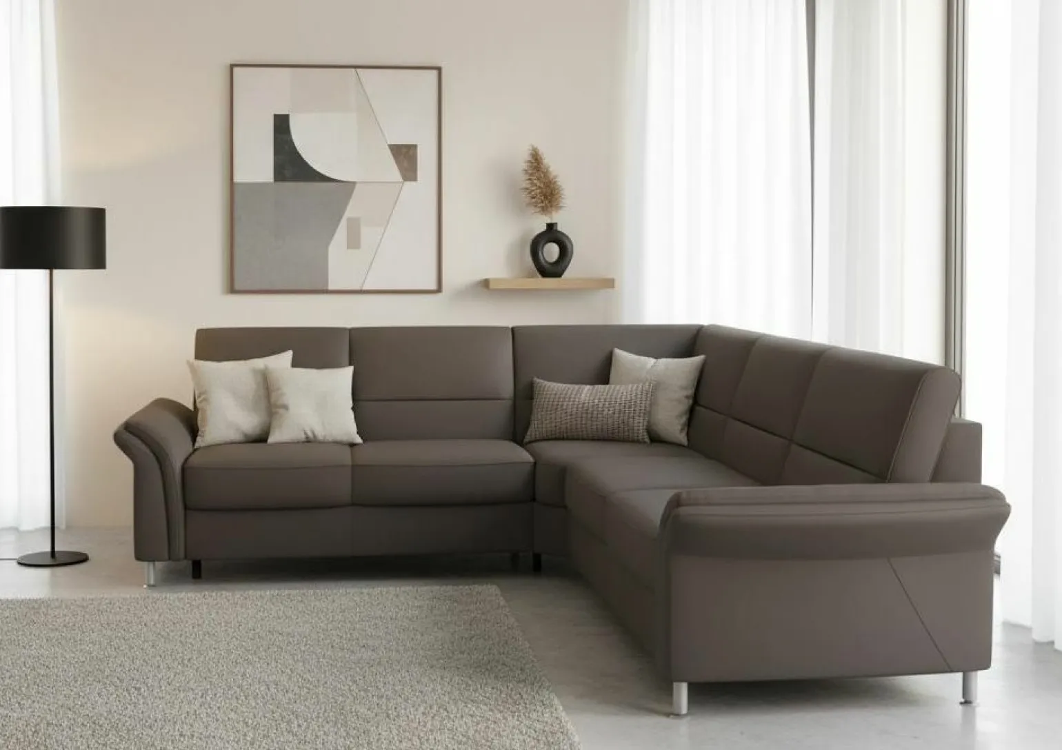 Entdecken Sie die rustikale Eleganz der Prada-S Polstergarnitur. Mit ihrer großzügigen Breite von 249 cm und einer Tiefe von 288 cm bietet sie reichlich Platz für entspannte Abende. Der hochwertige Stoff in warmem Braun fügt sich nahtlos in jedes Landhausambiente ein und sorgt für ein gemütliches Wohngefühl. Die Sitzhöhe von 49 cm und eine Sitztiefe von 54 cm bieten optimalen Komfort. Der rustikale Stil der Garnitur wird durch die harmonische Kombination von Farbe und Material unterstrichen und macht sie zum Herzstück Ihres Wohnzimmers.