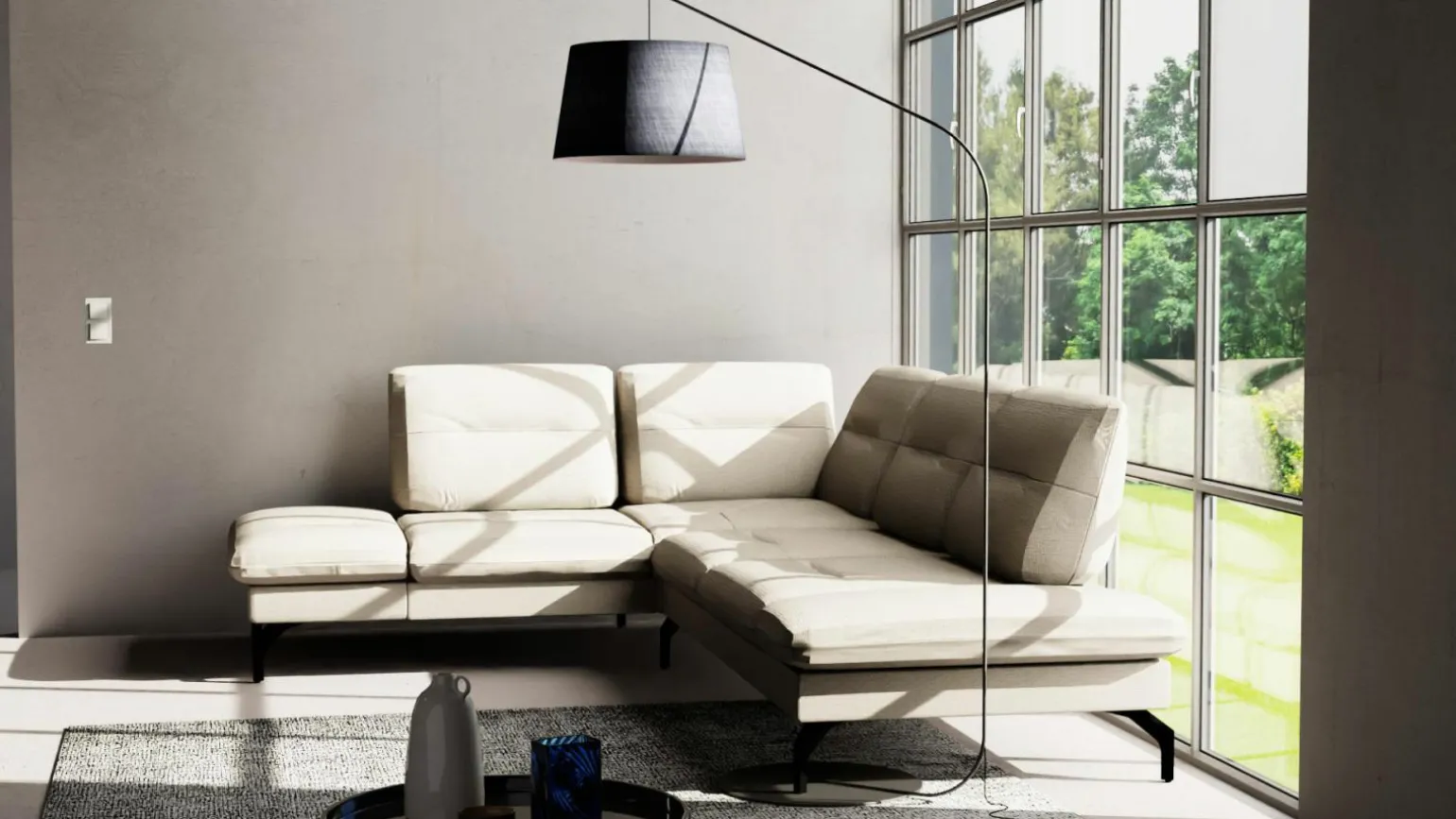 Die Pamelina Polstergarnitur präsentiert sich in einem modernen Stil, der durch ihre elegante graue Farbgebung und das hochwertige Stoffmaterial unterstrichen wird. Mit einer großzügigen Breite von 235 cm und einer Tiefe von 295 cm bietet sie reichlich Platz für entspannte Stunden. Die komfortable Sitzhöhe von 46 cm und die variierbare Sitztiefe von 55 bis 70 cm erlauben individuelle Anpassungen für höchsten Sitzkomfort. Die Polstergarnitur vereint Funktionalität mit stilvollem Design und fügt sich nahtlos in jede moderne Wohnumgebung ein. Erhöhen Sie den Stil Ihres Wohnzimmers mit dieser exquisiten Wahl.
