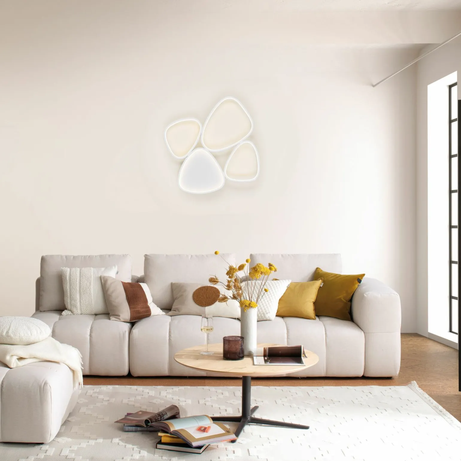 Verleihen Sie Ihrem Raum mit der modernen LED-Deckenleuchte Pebbles einen eleganten Touch. Diese stilvolle Beleuchtungslösung in strahlendem Weiß fügt sich nahtlos in jedes zeitgenössische Interieur ein. Mit einer Breite von 66 cm und einer Tiefe von 69,5 cm bietet sie eine großzügige Ausleuchtung. Die Höhe von 6,2 cm sorgt für eine dezente Präsenz an Ihrer Decke, während die innovative LED-Technologie für eine energieeffiziente und langlebige Beleuchtung sorgt. Die geschmackvolle Gestaltung der Leuchte hebt Ihre Einrichtung hervor und schafft eine angenehme Atmosphäre.