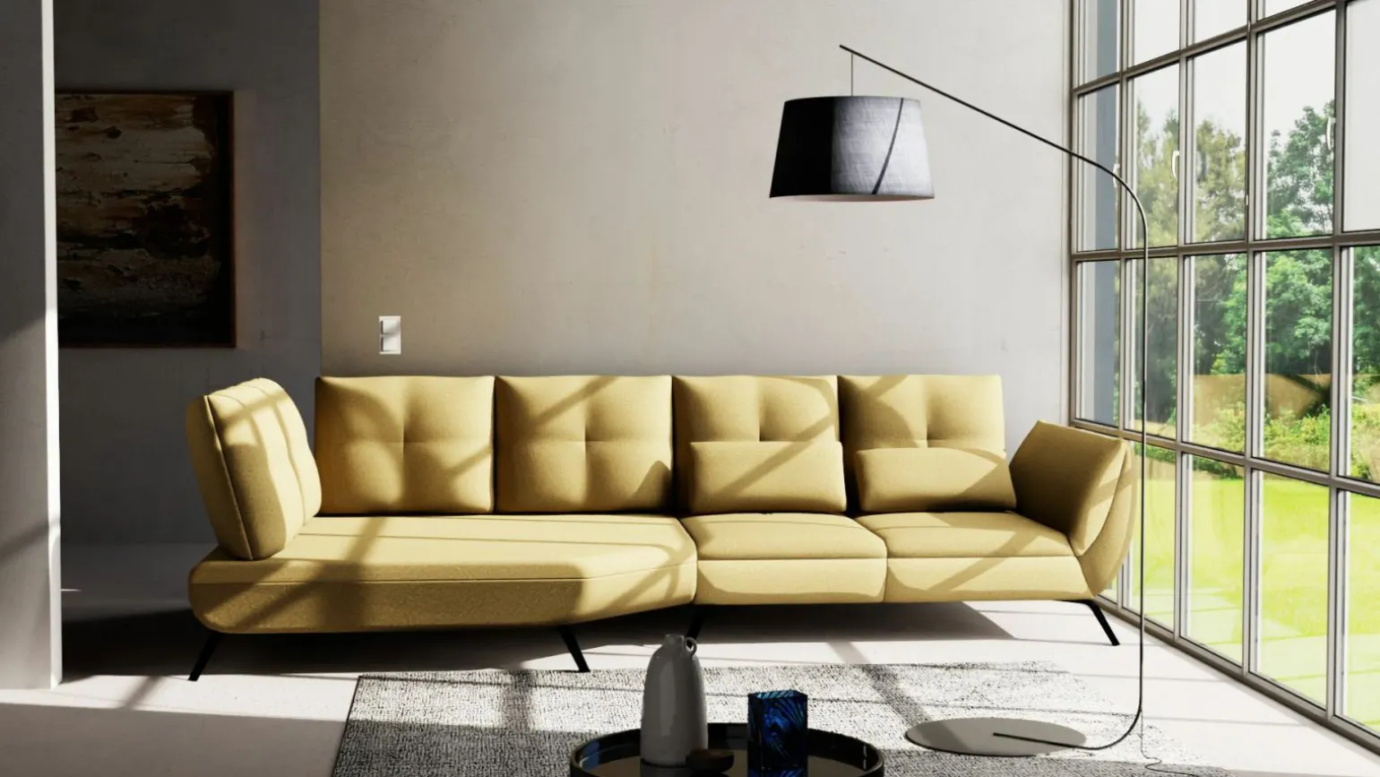 Entdecken Sie die stilvolle Trapezeckgarnitur Riverdale XC in einem modernen Design, das in jeder Umgebung ein Highlight setzt. Die großzügigen Maße von 93 cm Höhe, 320 cm Breite und einer Tiefe von 169 cm bieten drei bequeme Sitzplätze auf einer Sitzhöhe von 43 cm. Der hochwertige grüne Stoffbezug harmoniert perfekt mit dem robusten Metallgestell der Füße. Dank des Echtrückens ist die Garnitur rundum ansprechend und kann frei im Raum platziert werden. Diese elegante Kombination aus Design und Komfort macht das Möbelstück zu einem idealen Begleiter für Ihr Zuhause.