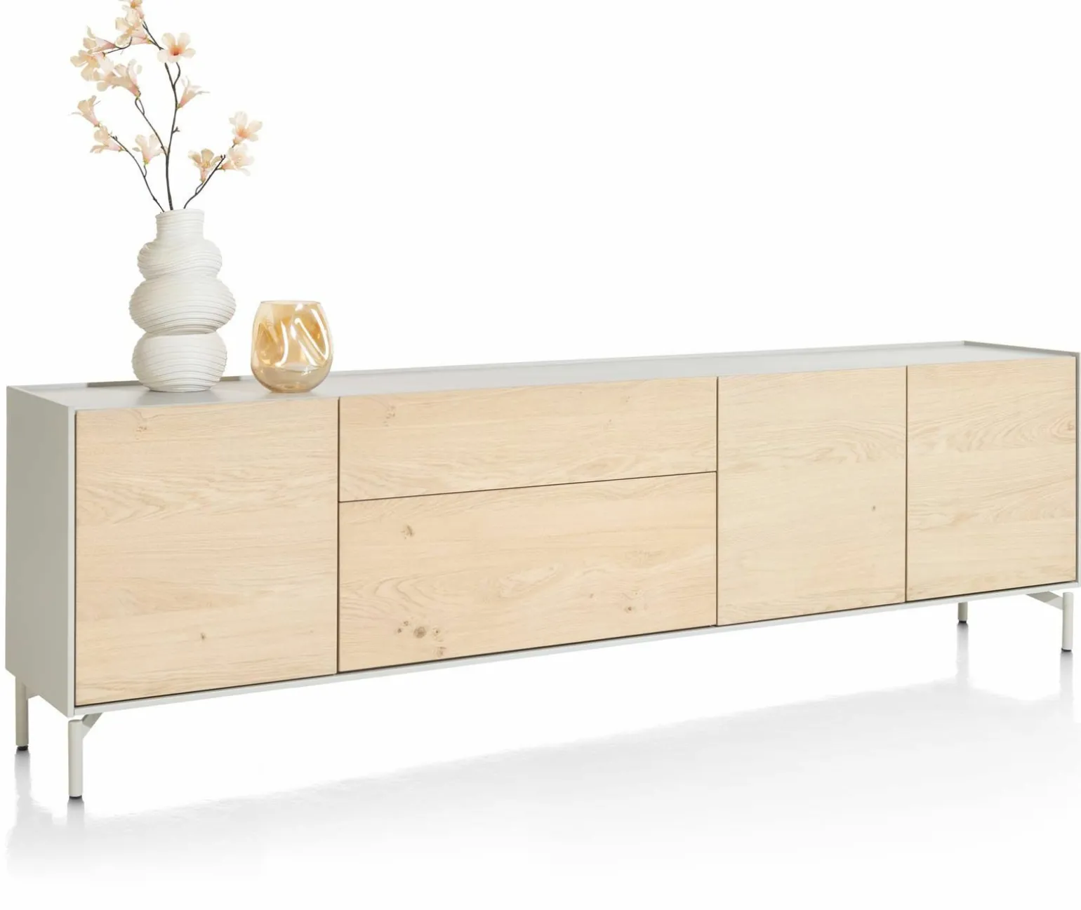 Entdecken Sie das elegante und moderne Niora Sideboard in stilvollem Grau. Mit einer beeindruckenden Breite von 240 cm und einer Höhe von 70 cm fügt es sich harmonisch in Ihr Zuhause ein und bietet großzügigen Stauraum. Das Sideboard ist aus hochwertigem Holz furniert und verspricht langlebige Qualität. Die grauen Metallfüße verleihen dem Möbelstück einen stabilen und modernen Look. Mit einer Tiefe von 42 cm eignet es sich ideal, um Funktionalität und ästhetische Ansprüche zu vereinen. Erleben Sie eine perfekte Kombination aus Design und Funktion für Ihr Wohnzimmer.