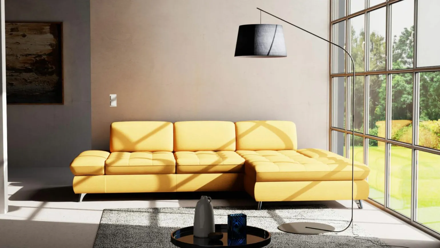 Erleben Sie modernen Komfort mit der stilvollen Ramira Eckgarnitur in leuchtendem Gelb. Diese elegante Sitzgelegenheit ist aus hochwertigem Stoff gefertigt und bietet einen Echtrücken für ein harmonisches Gesamtbild, egal wo Sie sie platzieren. Die großzügigen Maße von 316 cm Breite und 186 cm Tiefe bieten ausreichend Raum, während die Sitzhöhe von 43 cm optimalen Komfort garantiert. Das robuste Metallgestell sorgt für Stabilität und Langlebigkeit. Perfekt für zeitgenössische Wohnräume, verleiht diese Eckgarnitur Ihrem Zuhause einen Hauch von Eleganz und Funktionalität.
