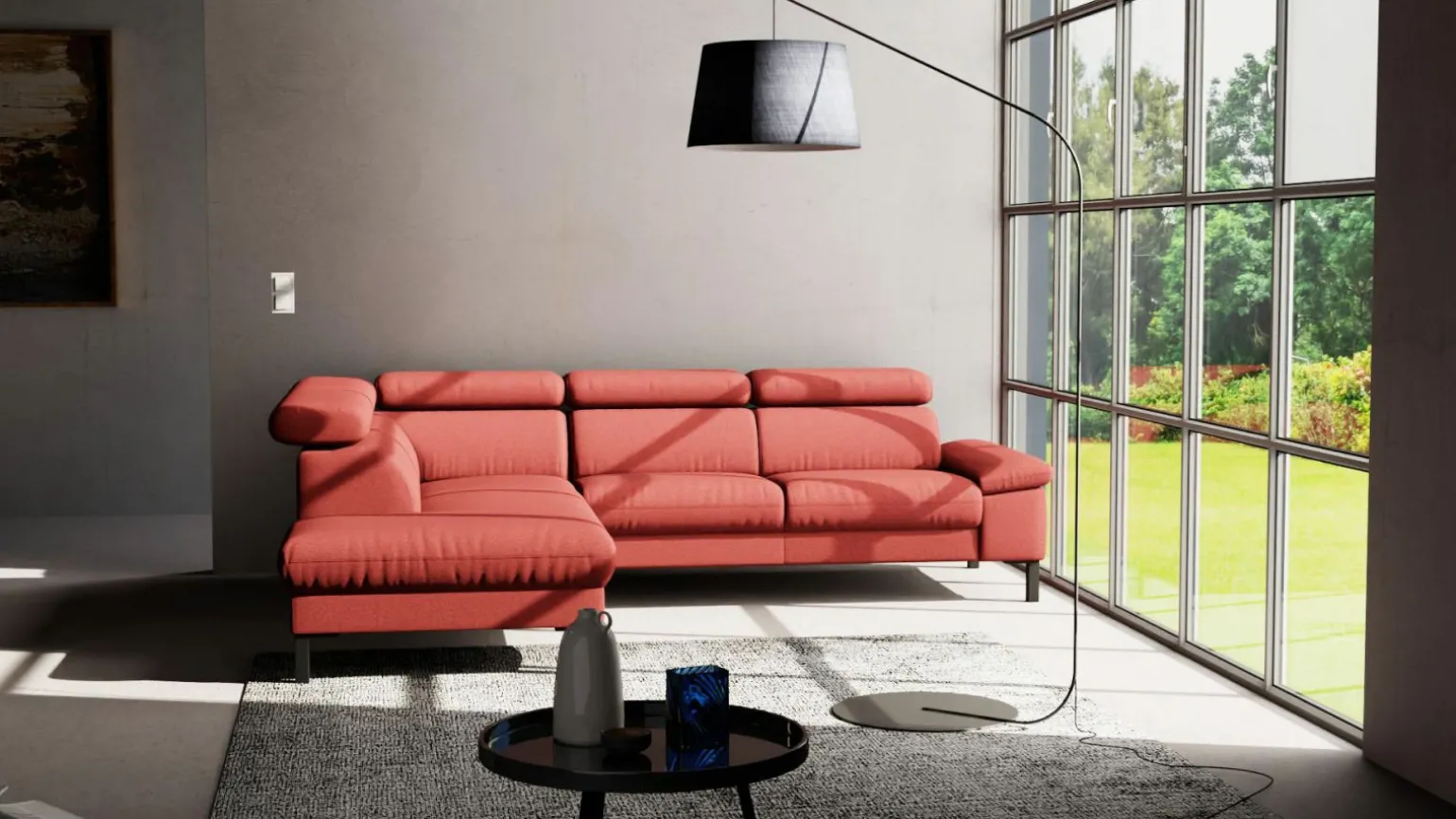 Erleben Sie modernen Komfort mit der stilvollen Eckgarnitur Elke in einem lebendigen Rotton. Mit einer großzügigen Breite von 217 cm und einer Tiefe von 272 cm bietet sie ausreichend Platz für bis zu vier Personen. Der Stoffbezug sorgt für ein angenehmes Sitzgefühl, während die Sitzhöhe von 46 cm optimalen Komfort verspricht. Die Konstruktion aus hochwertigen Materialien wird durch ein robustes Metallgestell unterstützt. Diese Eckgarnitur verfügt über einen Echtrücken, sodass sie frei im Raum platziert werden kann. Ein perfektes Möbelstück, um Ihrem Wohnbereich einen modernen und einladenden Look zu verleihen.