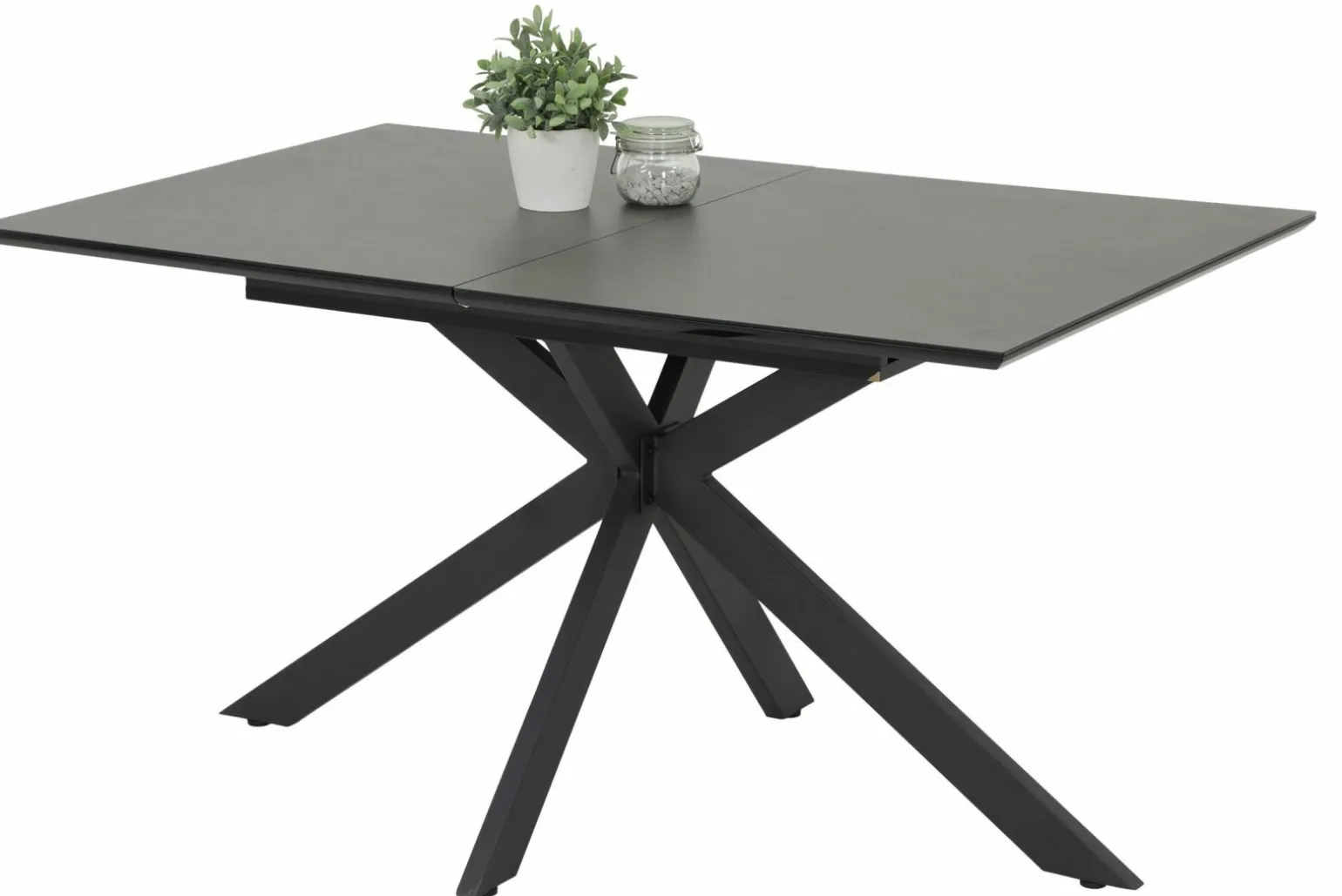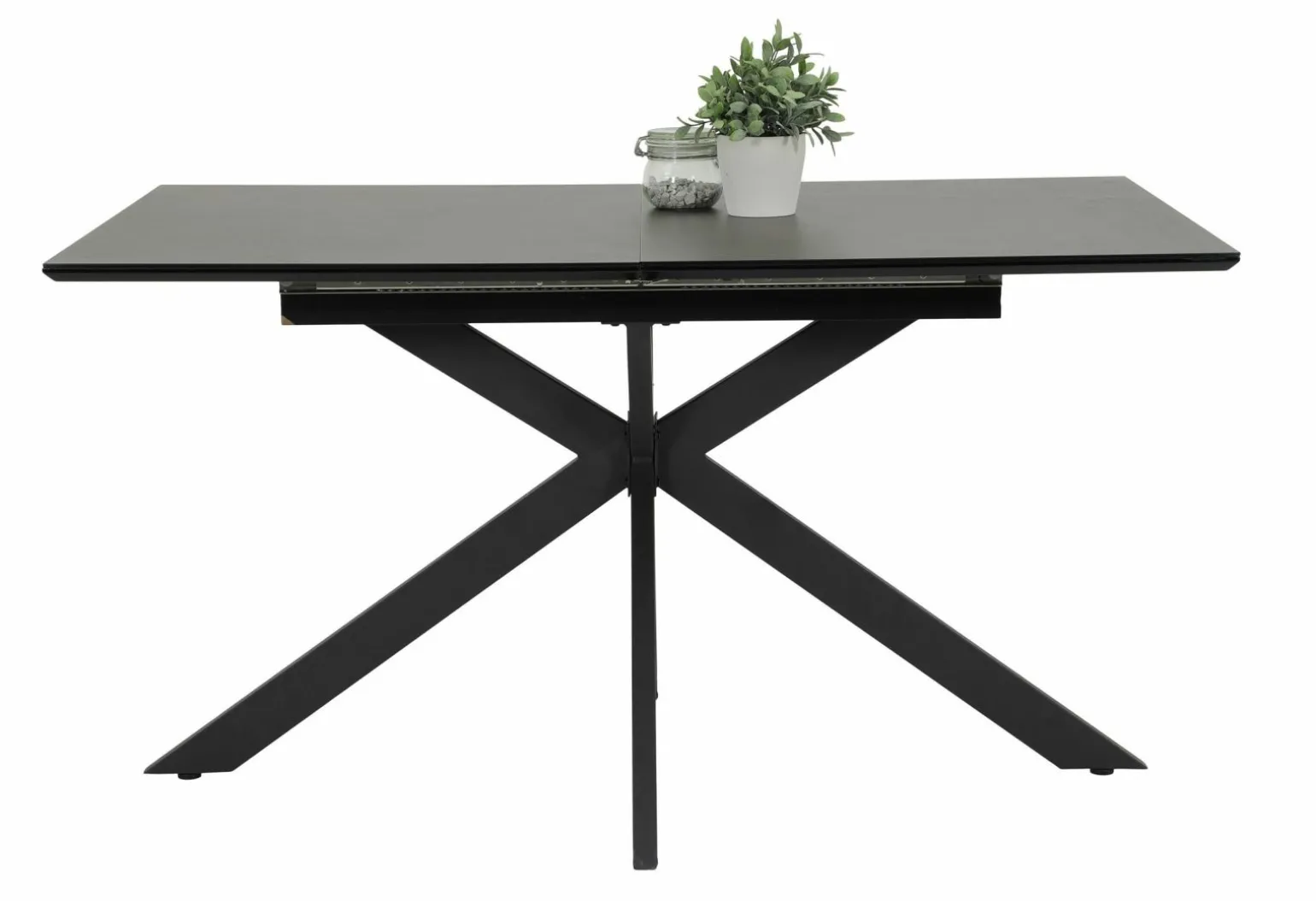 Entdecken Sie den eleganten Esstisch Modell, der Funktionalität und Stil perfekt vereint. Mit seiner ausziehbaren Tischplatte passt er sich flexibel Ihren Bedürfnissen an und bietet eine Breite von 140 bis 180 cm. Das robuste Gestell in X-Form aus grauem Metall sorgt für Stabilität und verleiht dem Tisch eine moderne Note. Die Tischplatte aus schwarzem Glas ergänzt das edle Design und macht ihn zu einem Blickfang in jedem Esszimmer. Mit einer Höhe von 76 cm und einer Tiefe von 90 cm ist dieser Tisch die ideale Wahl für stilbewusste Haushalte.