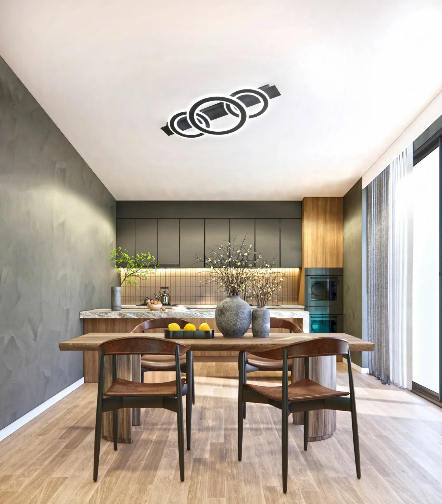 Erleben Sie eine moderne Beleuchtungslösung mit der Circle LED-Deckenleuchte. Diese stilvolle Leuchte besticht durch ihr minimalistisches Design und die elegante schwarze Metalloberfläche. Die hochwertige Verarbeitung kombiniert mit der fortschrittlichen LED-Technologie sorgt für eine energieeffiziente und langlebige Beleuchtung. Mit einer Tiefe von 76,50 cm fügt sich die Leuchte harmonisch in jeden Raum ein und bietet ein angenehmes Lichtambiente, das sowohl funktional als auch ästhetisch ansprechend ist. Perfekt für moderne Wohnräume, Büros oder Flure, bietet diese Leuchte eine zeitlose Eleganz und vielseitige Einsatzmöglichkeiten.