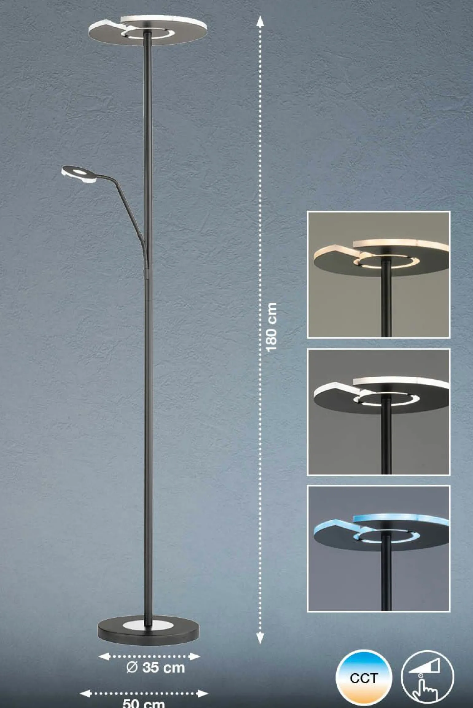 Erleben Sie modernes Design und funktionale Beleuchtung mit der Dent LED-Stehleuchte. Die stilvolle, runde Form und die elegante schwarze Farbe machen diese Leuchte zu einem echten Blickfang in jedem Raum. Mit einer beeindruckenden Höhe von 180 cm und einem Durchmesser von 35 cm fügt sie sich harmonisch in Ihre Wohn- oder Arbeitsumgebung ein. Das hochwertige Metall sorgt für Langlebigkeit und Stabilität. Diese zweiflammige LED-Leuchte bietet Ihnen eine optimale Lichtquelle für verschiedene Raumstimmungen und setzt Akzente, wo immer Sie sie platzieren. Genießen Sie die perfekte Kombination aus Ästhetik und Funktionalität.