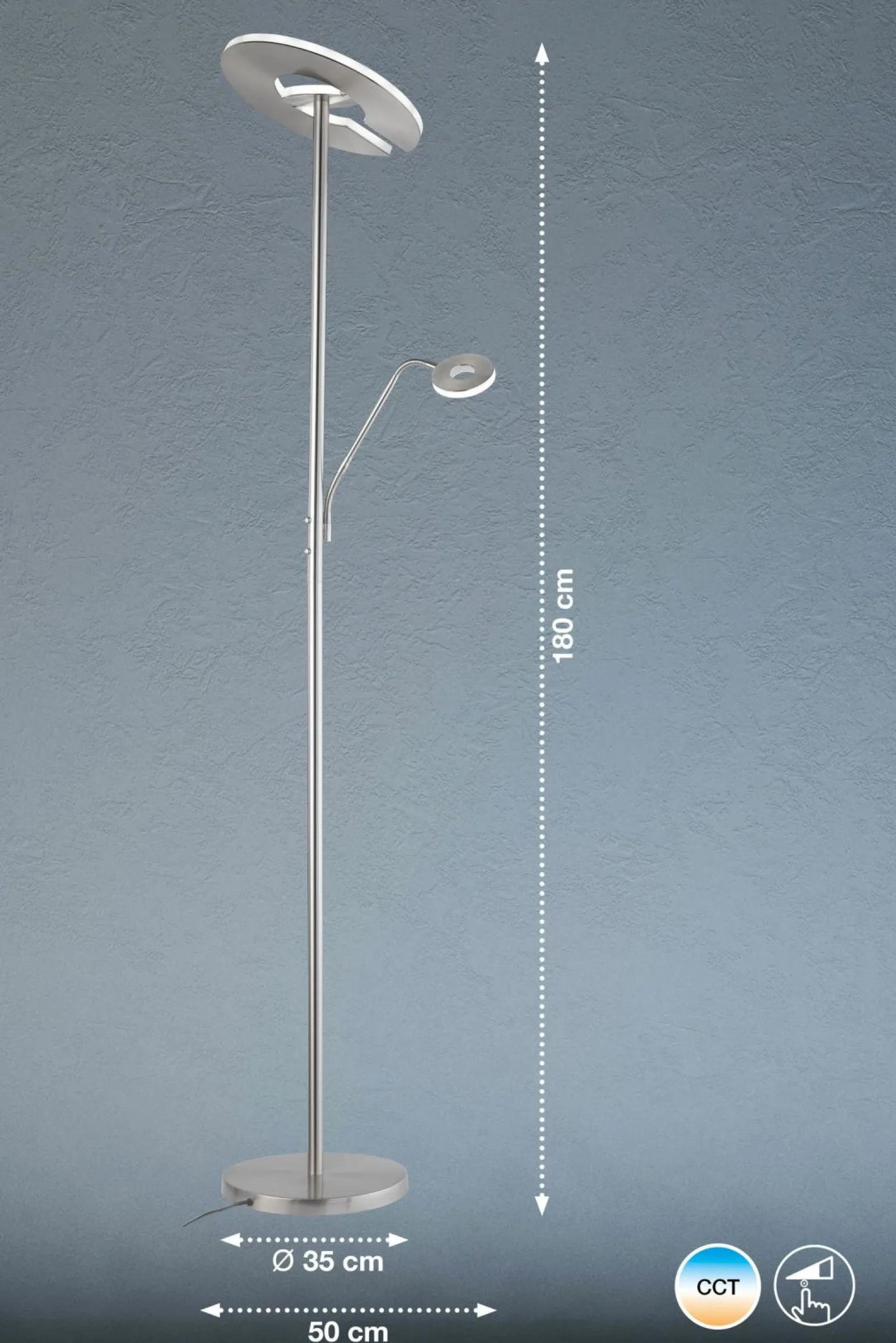 Die Dent LED-Stehleuchte vereint modernes Design mit funktionaler Beleuchtung. Diese zweiflammige Stehleuchte aus robustem Metall ist in einem eleganten Silberton gehalten, der Ihrem Wohnraum einen zeitlosen und stilvollen Akzent verleiht. Mit einer beeindruckenden Höhe von 180 cm und einem Durchmesser von 35 cm fügt sich diese Leuchte nahtlos in verschiedene Raumkonzepte ein. Das runde Design sorgt für gleichmäßige Lichtverteilung und schafft eine angenehme Atmosphäre. Ob im Wohnzimmer, Büro oder Schlafzimmer – diese Stehleuchte bietet Ihnen vielseitige Einsatzmöglichkeiten und sorgt für eine effiziente und ansprechende Beleuchtung.