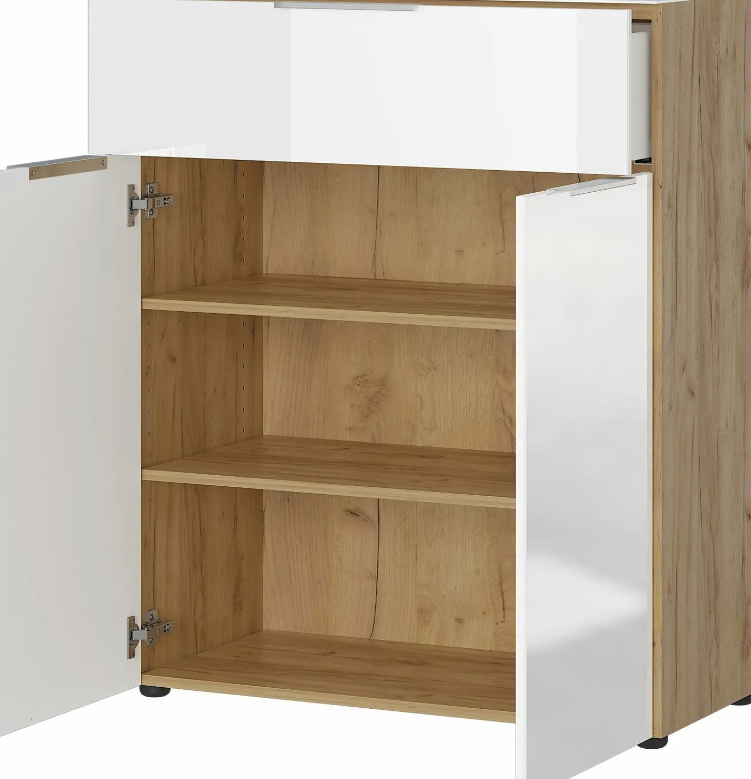 Die elegante Kommode Oakland verleiht jedem Raum einen Hauch von Stil und Funktionalität. Mit einer Höhe von 102 cm, einer Breite von 83 cm und einer Tiefe von 42 cm bietet sie ausreichend Stauraum und passt perfekt in verschiedenste Wohnbereiche. Die Kombination aus brauner und weißer Farbe harmoniert wunderbar mit dem hochwertigen Glasmaterial, das für eine moderne und zugleich zeitlose Optik sorgt. Diese Kommode ist ideal, um Ihre Wohnaccessoires stilvoll zu präsentieren oder um alltägliche Gegenstände ordentlich zu verstauen.