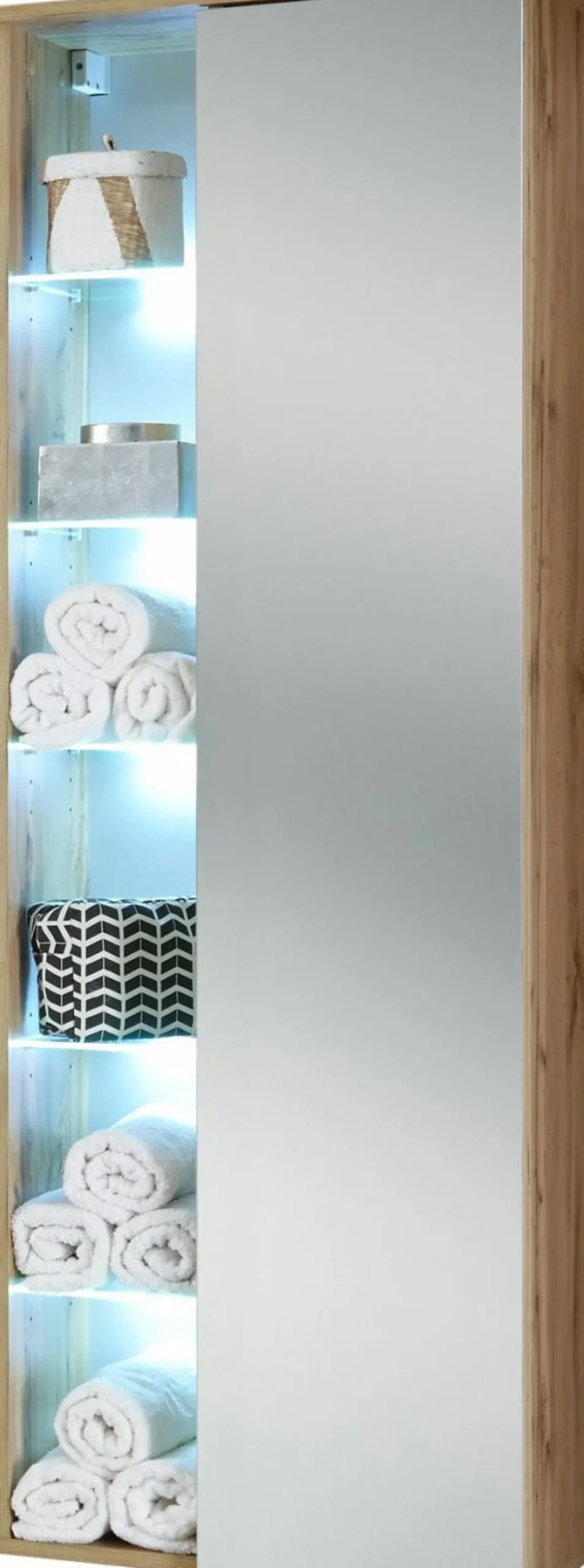 1 Spiegeltür, dahinter 5 Einlegeböden