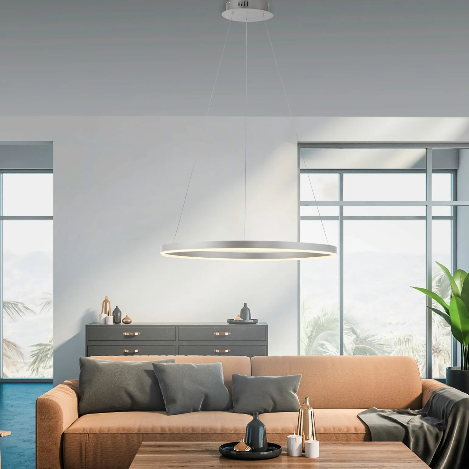 Die Ritus LED-Pendelleuchte besticht durch ihr elegantes Design und ihre hochwertige Verarbeitung aus Metall. Mit einem Durchmesser und einer Breite von 58,5 cm fügt sie sich harmonisch in jeden Raum ein und sorgt für eine gleichmäßige Ausleuchtung. Die silberne Oberfläche verleiht der Leuchte einen modernen und stilvollen Look, der zu verschiedenen Einrichtungsstilen passt. Mit einer Höhe von 120 cm ist sie ideal zur Beleuchtung von Essbereichen oder Arbeitsplätzen geeignet. Die einflammige Konstruktion sorgt für eine angenehme Lichtatmosphäre, die Ihre Räume in ein warmes und einladendes Ambiente taucht.