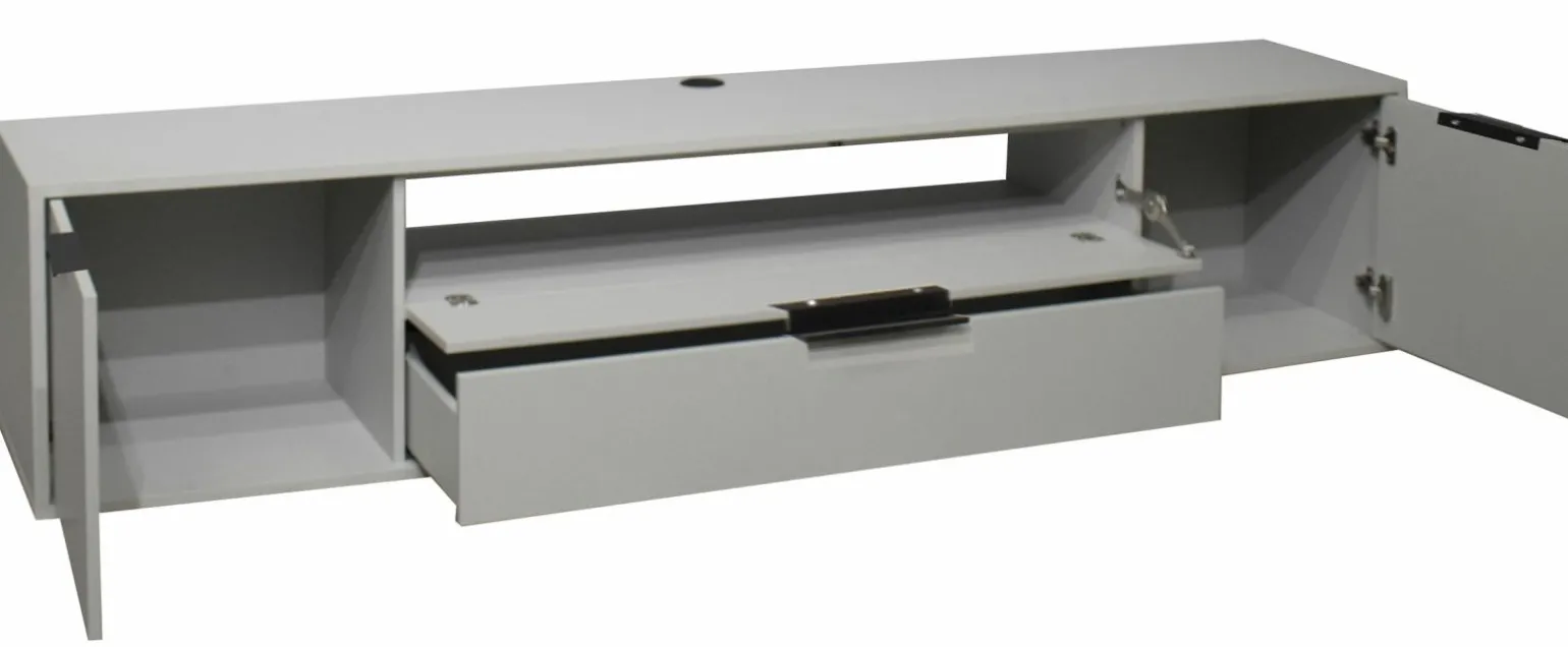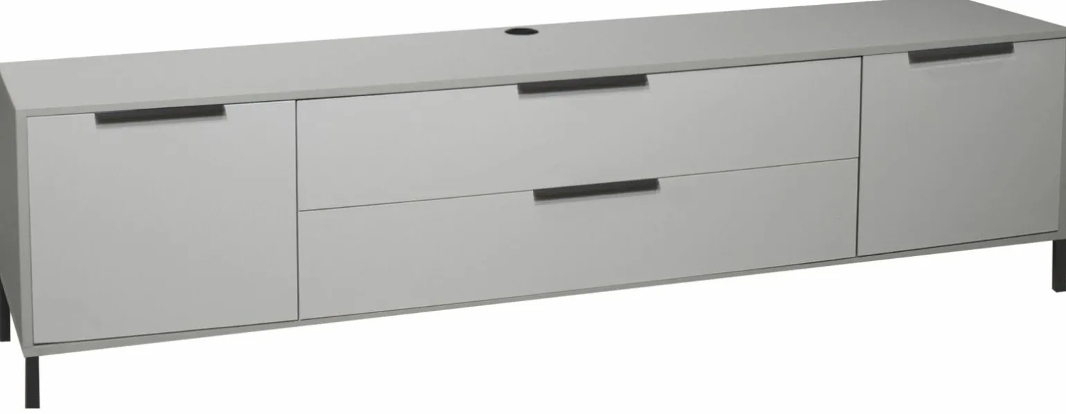 Das Lowboard Bonnie präsentiert sich in einem eleganten grauen Farbton und fügt sich harmonisch in jedes moderne Wohnambiente ein. Mit einer Breite von 216 cm, einer Höhe von 47 cm und einer Tiefe von 45 cm bietet es großzügigen Stauraum für Ihre Mediengeräte und Zubehör. Gefertigt aus hochwertigem Holzfaserwerkstoff, vereint es Robustheit mit stilvollem Design. Dieses Möbelstück ist ideal für Wohnzimmer, die funktionale Eleganz schätzen und nach einer praktischen Lösung für Ordnung suchen. Erleben Sie die perfekte Ergänzung für Ihre Einrichtung mit dem stilvollen Lowboard Bonnie.