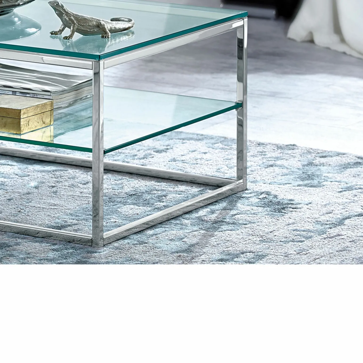 Tischplatte Klarglas 12 mm stark und Ablageplatte Klarglas 10 mm stark. Gestell in chrom. Preis exklusive Dekoration.