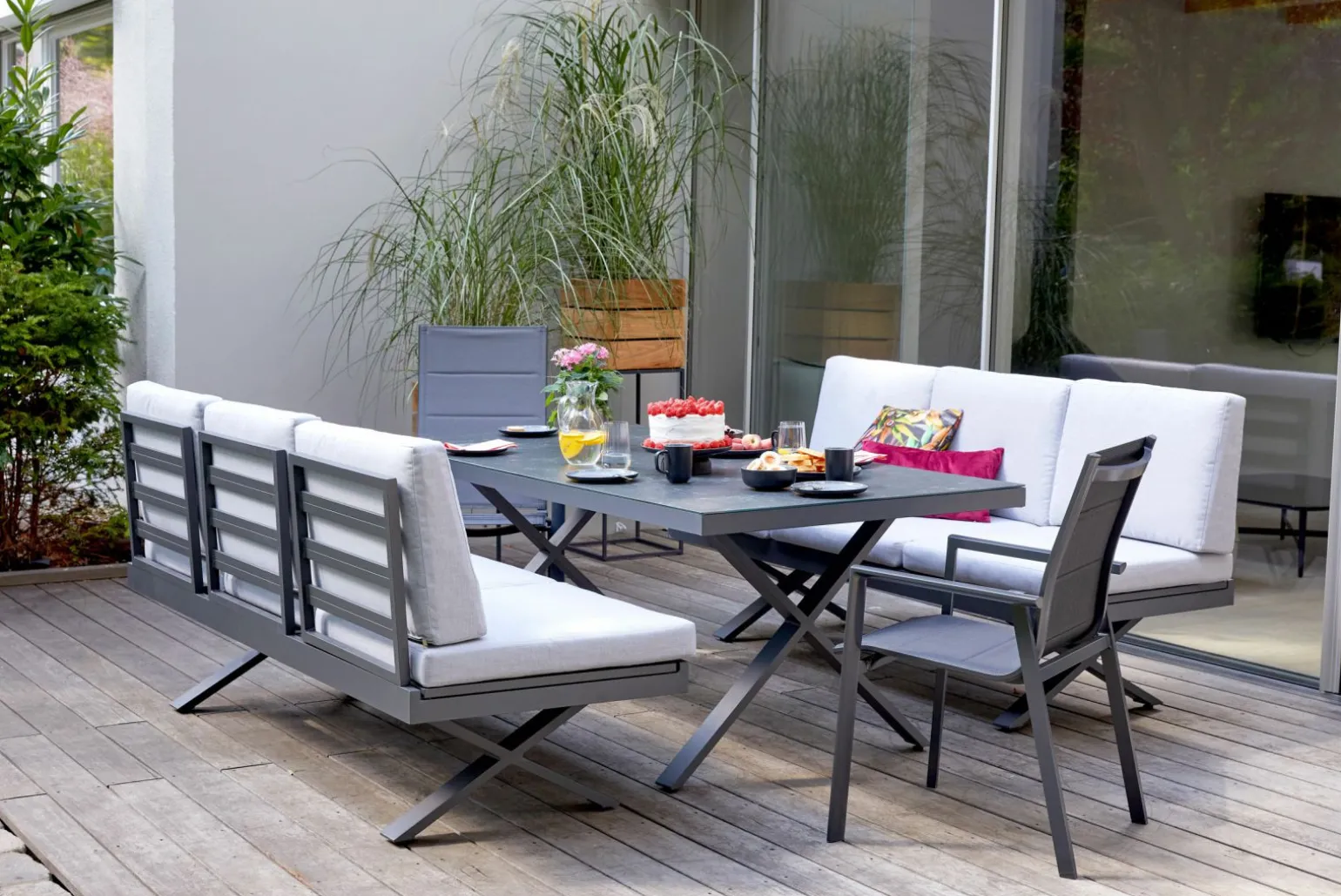 Entdecken Sie das Gartensofa Rieke III, das mit seiner klaren Linienführung und dem robusten Metallmaterial jeden Außenbereich stilvoll ergänzt. Mit einer Breite von 198 cm und einer Höhe von 95,5 cm bietet es großzügigen Platz und lädt zum Entspannen ein. Die innovative Klappfunktion auf der linken Seite ermöglicht eine flexible Anpassung an Ihre Bedürfnisse und macht es zum perfekten Begleiter für gemütliche Stunden im Freien. Mit einer Tiefe von 72 cm vereint es Komfort und Funktionalität, ohne auf Stil zu verzichten. Gönnen Sie sich dieses moderne Möbelstück für Ihren Garten.