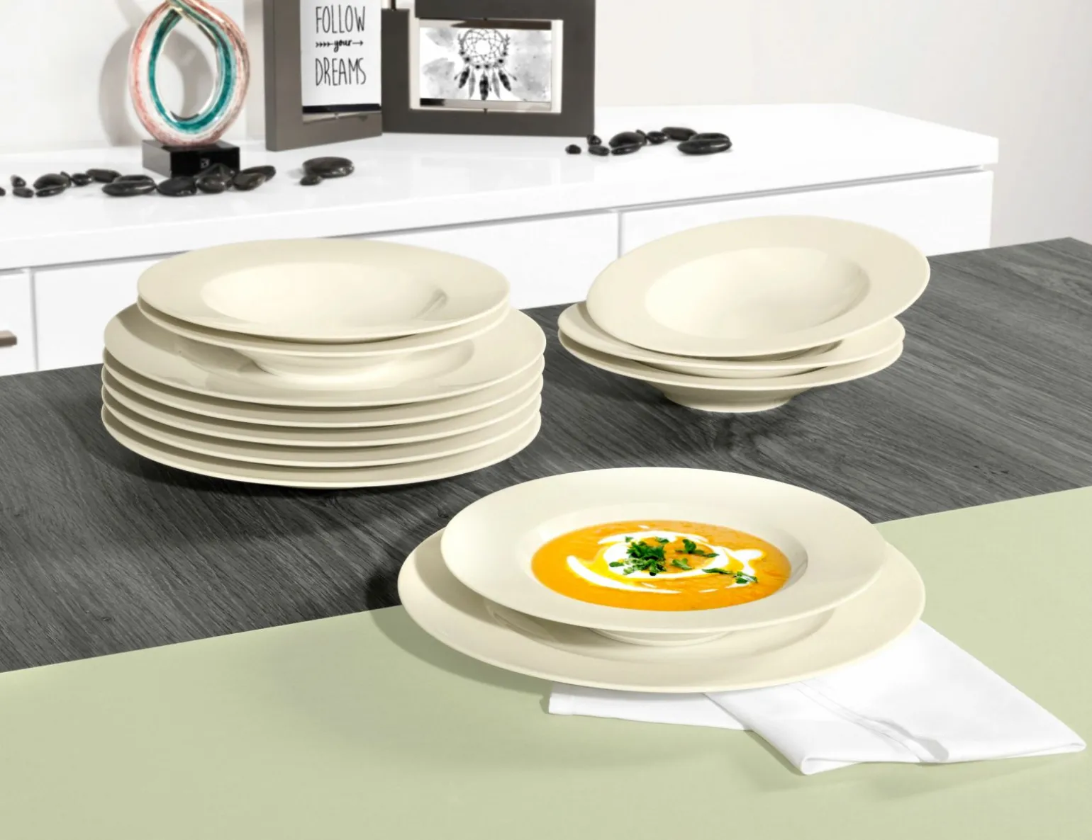 Verleihen Sie Ihrem Esstisch mit dem edlen Tafelgeschirr Zoe aus hochwertigem Porzellan in elegantem Beige einen Hauch von Raffinesse. Dieses 12-teilige Set bietet Platz für bis zu sechs Personen und eignet sich perfekt für Familienessen oder besondere Anlässe. Die sanfte Farbgebung harmoniert wunderbar mit unterschiedlichen Tischdekorationen und sorgt für ein stilvolles Ambiente. Das Porzellanmaterial verspricht Langlebigkeit und einfache Pflege, ideal für den täglichen Gebrauch und festliche Gelegenheiten gleichermaßen. Erleben Sie die perfekte Kombination aus Funktionalität und zeitloser Eleganz mit diesem auserlesenen Geschirrset.