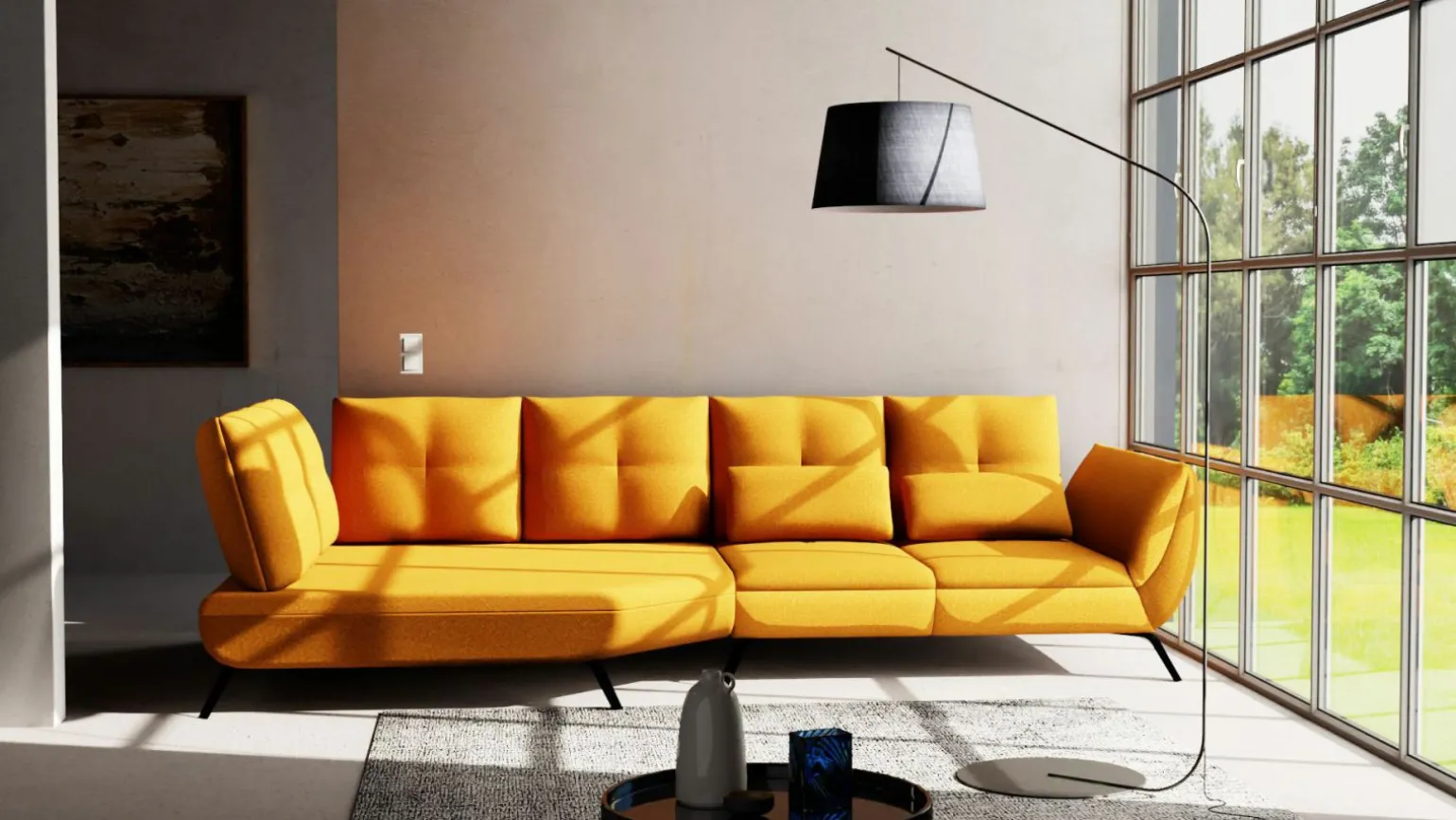 Erleben Sie modernen Komfort mit der stilvollen Riverdale Trapezeckgarnitur in einem auffälligen Gelbton. Diese elegante Sitzgelegenheit bietet ausreichend Platz für bis zu drei Personen und passt perfekt in ein zeitgemäßes Wohnzimmer. Der hochwertige Stoffbezug in Kombination mit einem robusten Metallgestell sorgt für Langlebigkeit und Stabilität. Mit einer Sitzhöhe von 43 cm und einer beeindruckenden Breite von 320 cm ist sie ideal für entspannte Abende. Der Echtrücken ermöglicht flexible Platzierungsmöglichkeiten in Ihrem Raum. Genießen Sie das exquisite Design und die großzügigen Dimensionen, die diese Garnitur zu einem unverzichtbaren Bestandteil Ihrer Einrichtung machen.
