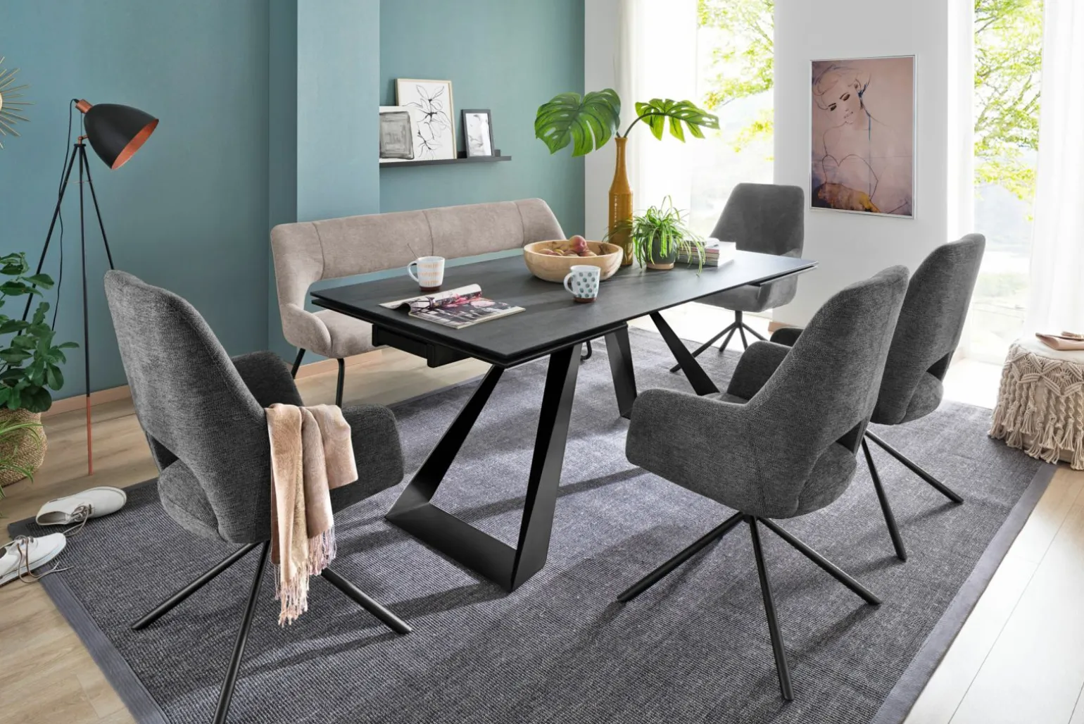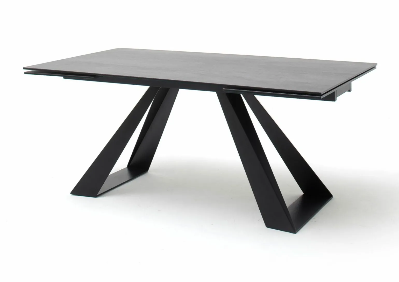 Der Vito Crowd Esstisch vereint klassischen Stil mit modernen Materialien. Die edle graue Keramik-Tischplatte bietet eine stilvolle und robuste Oberfläche, die durch ihr elegantes Design besticht. Mit einer Breite von 180 cm und einer Tiefe von 90 cm bietet er großzügigen Platz für Ihre Gäste. Das schwarze Metallgestell in Kufenform verleiht dem Tisch eine stabile Basis und verleiht jedem Raum einen Hauch von Raffinesse. Praktisch ist der ausziehbare Stirnauszug, der den Tisch flexibel für mehr Gäste nutzbar macht. Perfekt für gesellige Abende und stilvolle Dinnerpartys.