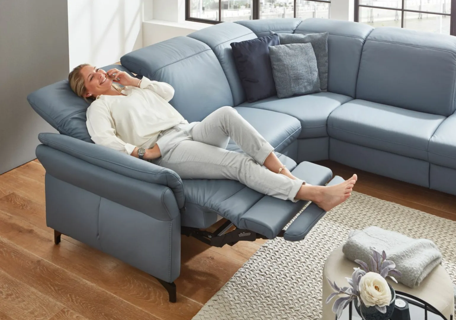 Erleben Sie modernen Komfort und stilvolle Eleganz mit der Vito Sardena Polstergarnitur in einem ansprechenden Blau. Diese hochwertige Garnitur aus edlem Leder bietet nicht nur Langlebigkeit, sondern auch höchsten Sitzkomfort durch eine Sitzhöhe von 46 cm und eine Sitztiefe von 53 cm. Mit einer Breite von 263 cm und einer Tiefe von 241 cm ist sie ideal für jeden Wohnraum, der auf modernen Stil und Funktionalität setzt. Dieses Möbelstück vereint zeitgemäßes Design mit praktischer Nutzbarkeit und fügt sich nahtlos in Ihr Zuhause ein.